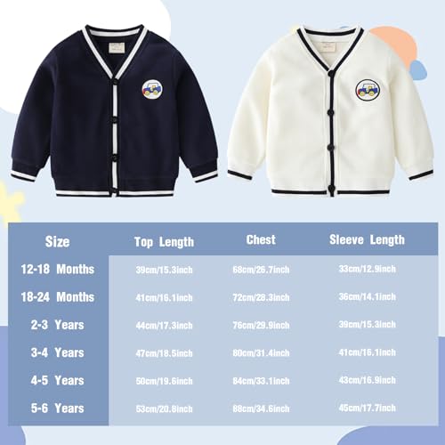 Fabric type: 95% Cotton blend 5% OtherCare instructions: Machine WashOrigin: ImportedClosure type: ButtonPremium Fabric: Baby boy long sleeve cardigan is made of excellent cotton blend material, which is lightweight and skin-friendly. The soft fabric ensures kids are comfortable and stay warm in cooler weather.distinctive Design: Boys' top features a solid color long sleeve design with a cute car embroidery print. The V-neck button up design of knit sweater makes it easy for kids to put on and take off easily. The clothes cuffs and hems are elasticized to give toddler a comfortable fit.Wide Applications: Toddler boy clothes are not only suitable for daily wear, but also suitable for formal occasions: parties, family gatherings, birthdays, photo shoots and so on. Little boy knit coat can be paired with a variety of outfits, Perfect for spring, fall, winter seasons.Ideal Gift: Boys cotton clothes with 2 colors to choose from: white, navy blue, sophisticated and fashionable style, great match for casual or formal dress up. Baby cardigan sweater is also a great gift for little boys and loved by moms.Size: Toddler V-Neck cardigan sweater is available in six different sizes, include: 12-18 months, 18-24months, 2-3 years, 3-4 years, 4-5 years, 5-6 years. Please refer to the size chart for specific information to find the right size for your baby. Perfect for everyday use. High quality materials and excellent craftsmanship ensure long-lasting durability.