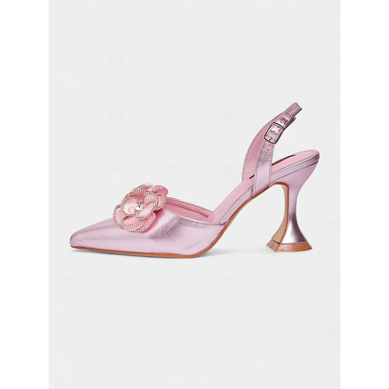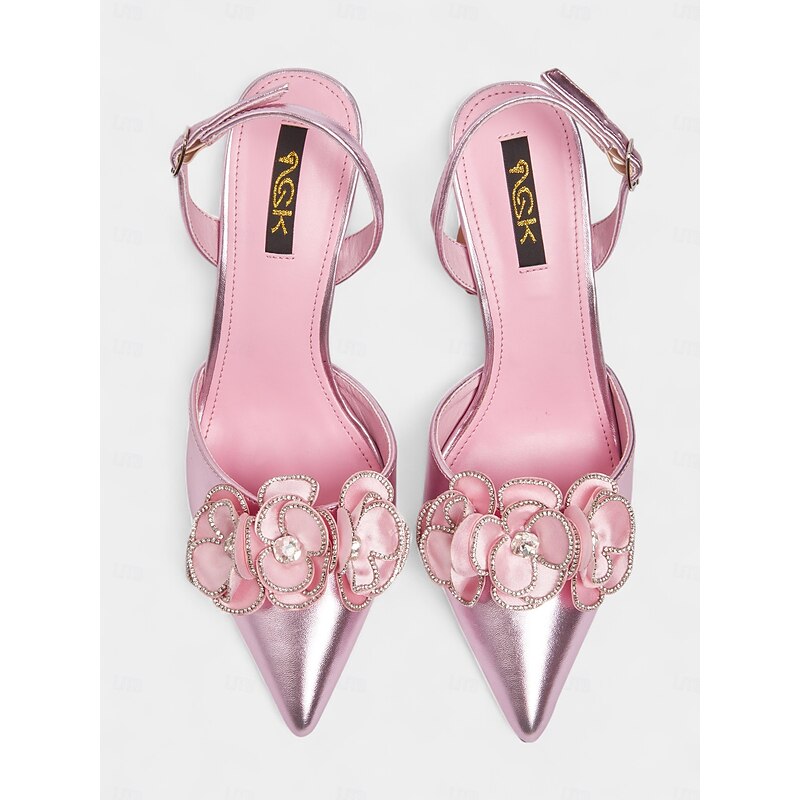 Women's Pink Satin Pointed Toe Heels with Floral Embellishment - Elegant Slingback Party Shoes for Nightlife and Cocktail Events 10