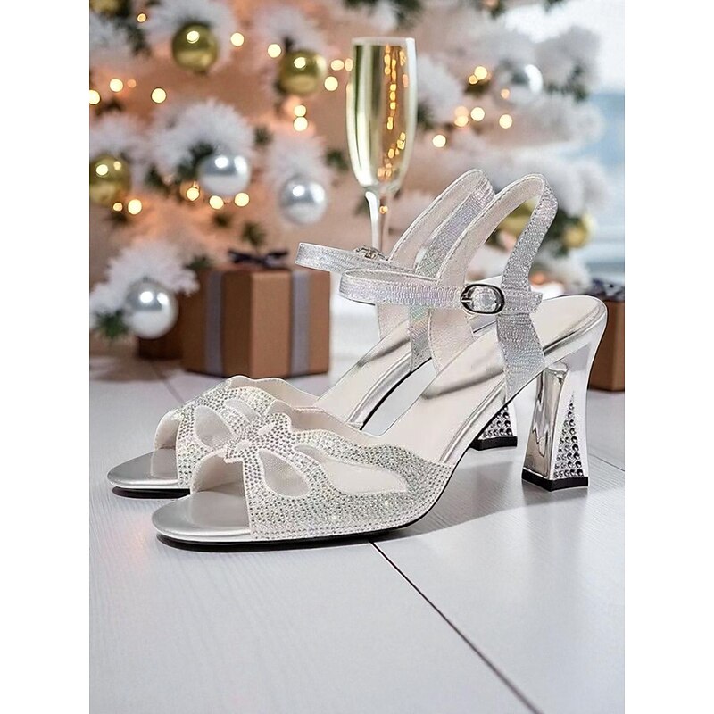 Highlights - Stylish upper material of sparkling glitter - Luxurious synthetic leather lining for comfort - Elegant rhinestone embellishments - Stable and trendy block heel design - Fashionable open toe shape - Durable rubber outsole for long-lasting wear