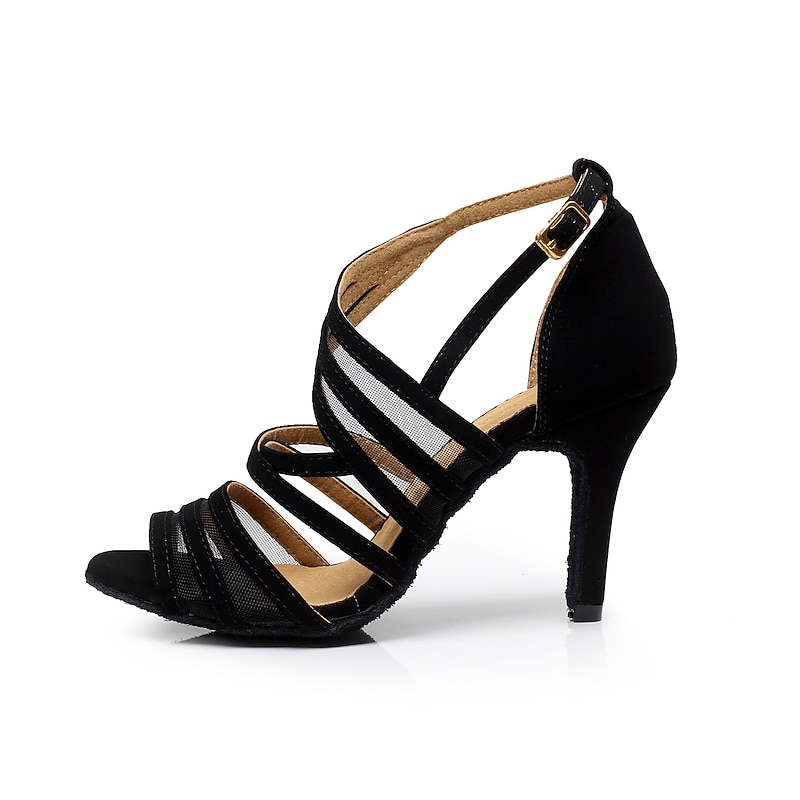 Highlights [Fabric and Material] Crafted with luxurious satin and breathable tulle, these women's dance shoes offer a sophisticated blend of style and comfort. The upper material ensures a soft feel against the skin while providing durability for rigorous dance sessions. [Style and Fit] Designed as elegant open-toe sandals with a high heel, these shoes feature a sleek black color, complemented by a mix of solid and mesh straps. The design creates an alluring silhouette that suits both practice sessions and formal dance occasions. [Design Highlights] The adjustable ankle strap with a small golden buckle ensures a secure fit while enhancing the shoe's elegant aesthetics. The slender heel, measuring between three to four inches, offers a graceful lift, adding to the overall sleek and modern look. [Occasions] Perfect for Latin, ballroom, salsa, and line dance practices. The versatile design makes these sandals ideal for a night out or any formal event, providing both charm and functionality for dance lovers. [Size Range] Available in a wide range of sizes from US4 to US10.5 (EU34 to EU42), accommodating a variety of foot sizes and ensuring a comfortable fit for all dancers.