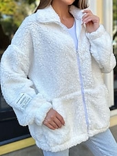 More information about Women's Fleece Jacket Teddy Coat Warm Breathable Zipper Pocket Fleece Lined Casual Plain Vacation Street Daily Wear Going out Zipper Regular Stand Collar Regular Fit Long Sleeve Outerwear White Pink
