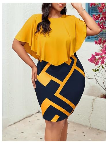 WDIRARA Women's Plus Size Geo Print Ruffle Cloak Sleeve Bodycon Dress Knee Length Pencil Dresses 4
