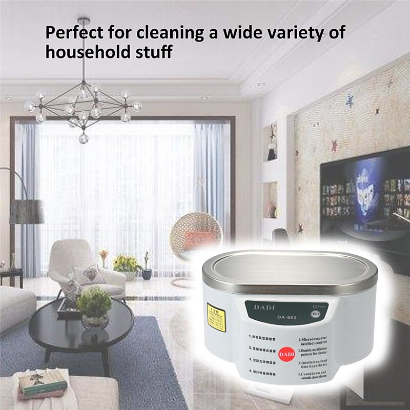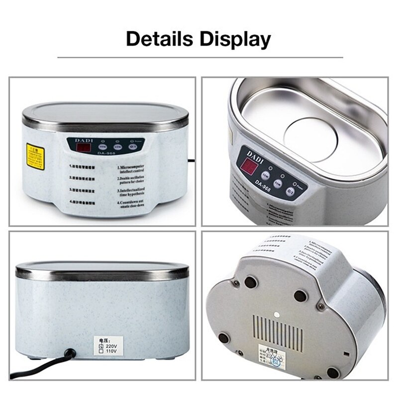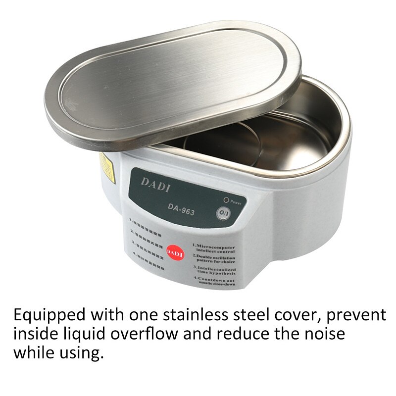 Highlights Product Selling Points: - Made of fine quality plastic material, solid and lightweight - Effectively removes dirt and grime, even from hard-to-reach areas - Does not damage delicate parts - Two digit display for easy control - Adjustable power options (30W and 50W) - Adjustable washing time (30W: 1-60min, 50W: 1-30min) - Good cleaning effect without harming any surface - Perfect for cleaning and sterilizing various items such as fruits, vegetables, glasses, shaver heads, dentures, watches, jewelry, camera lenses, circuit boards, electronic components, and surgical instruments - Can also be used for mixing drinks and different chemical reagents - Equipped with a stainless steel cover to prevent liquid overflow and reduce noise during use - Four non-slip bases for stability and preventing water from entering the main machine - Heat emission hole in the bottom for efficient thermolysis and quick operation.