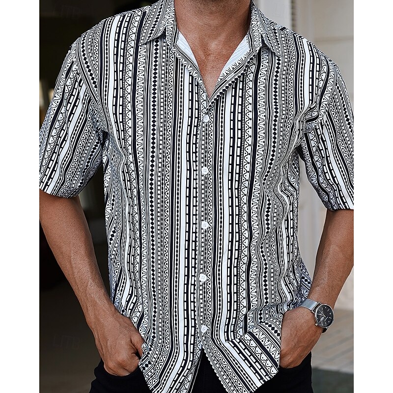 HOT ! Men's Shirt Summer Shirt Casual Shirt Beach Shirt Button Up Shirt Black Short Sleeve Stripes Shirt Collar Vacation Hawaiian Clothing Apparel Polyester Fashion Casual Comfortable