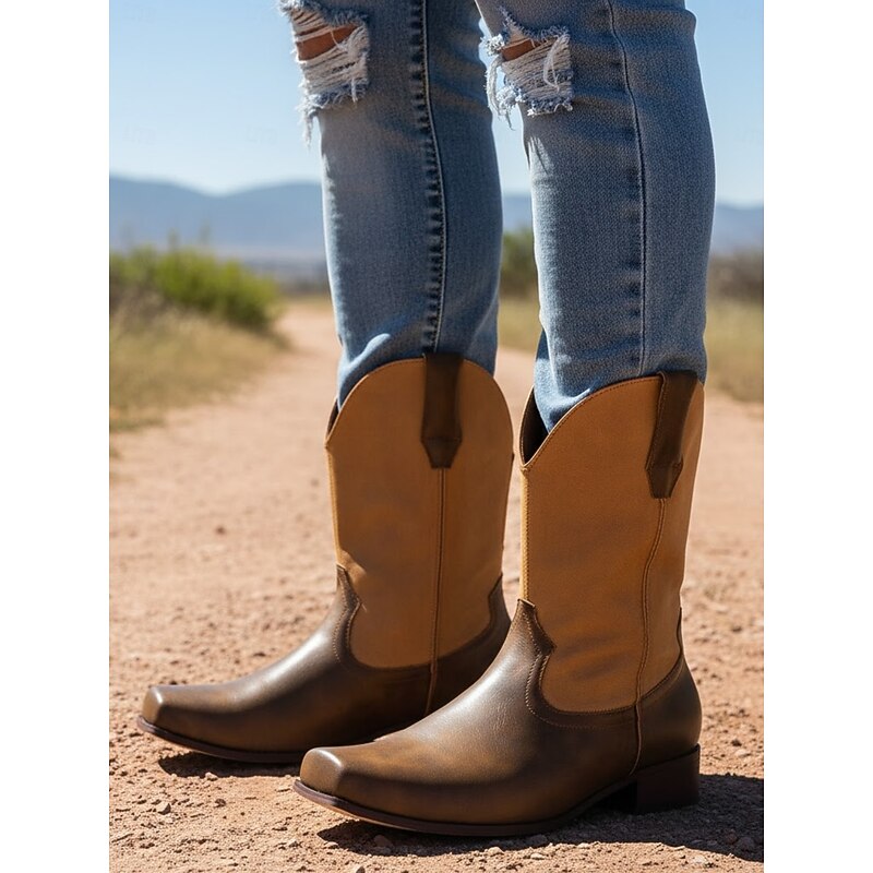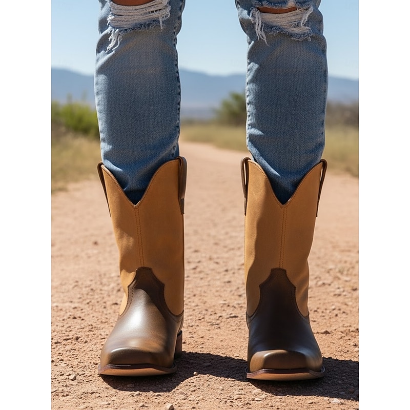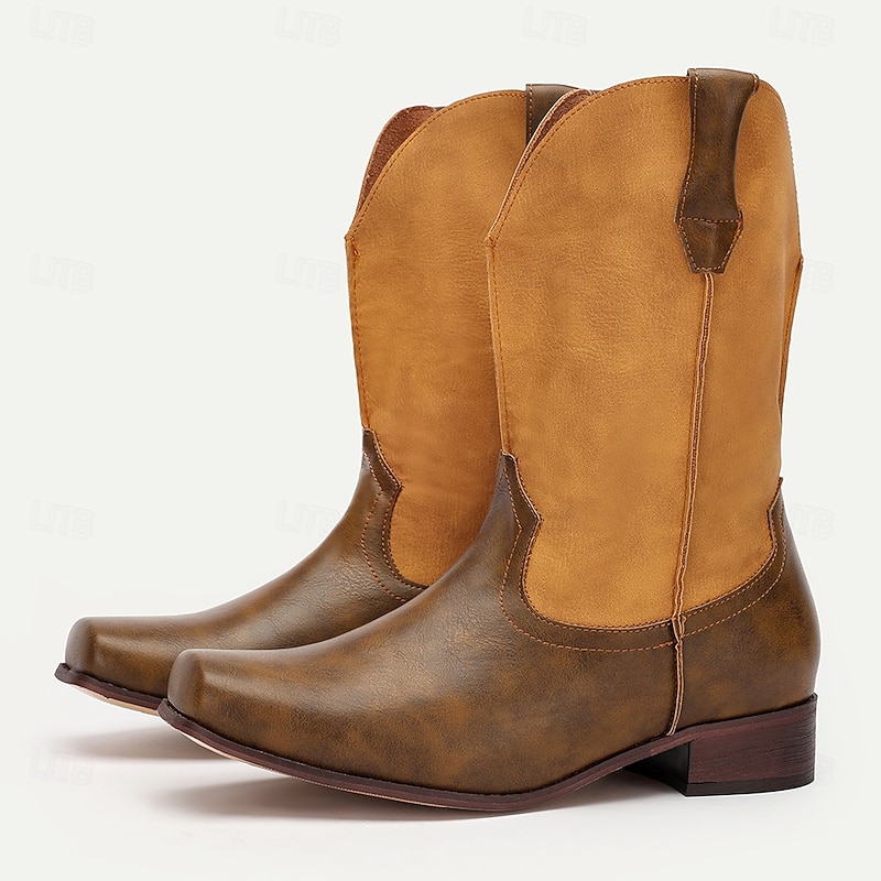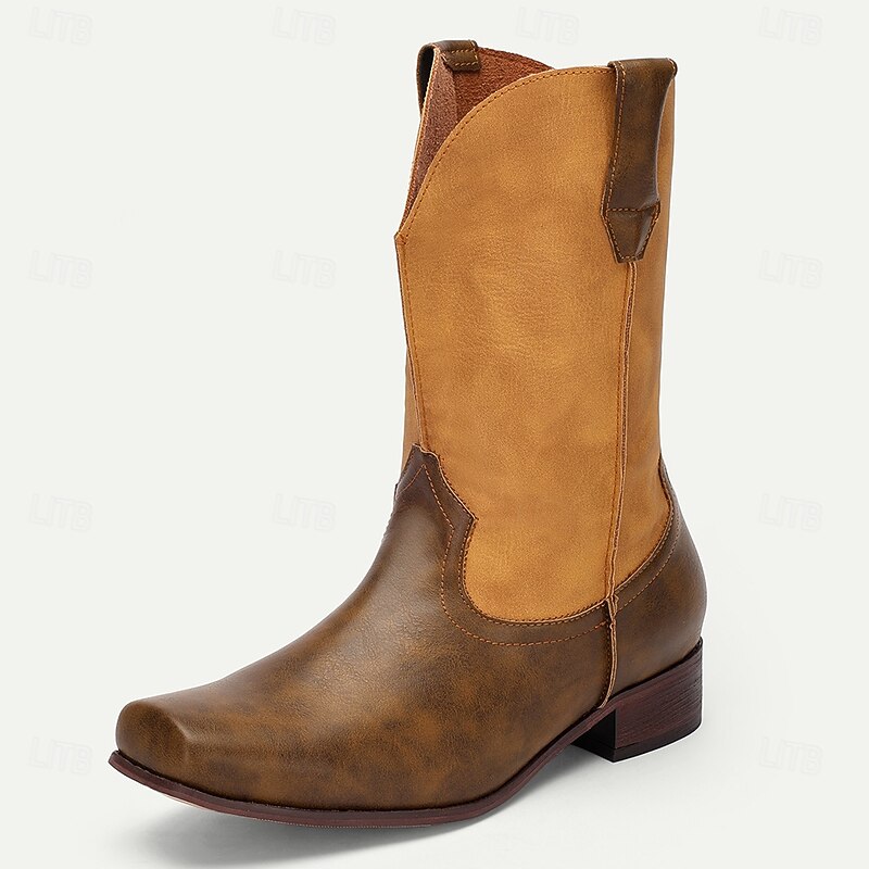 HOT ! Men's Western Cowboy Boots – Vintage Style Tan Faux Leather Mid-Calf Boots with Square Toe, Ideal for Outdoor and Casual Wear