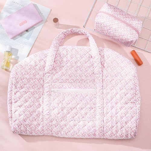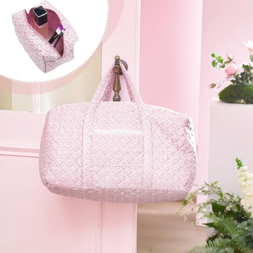 2 Pack Floral Travel Duffel Bag Large Quilted Travel Duffle Bag and Pink Floral Makeup Pouch Portable Gym Lightweight Weekender Organizer with Zipper Pockets Grocery Pouch for Women 2