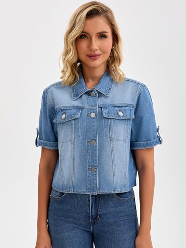 Womens Short Sleeve Denim Jackets 2025 Collared Button Up Cropped Jean Jacket 2