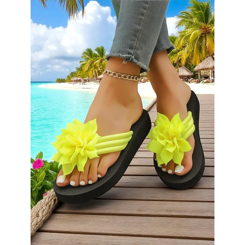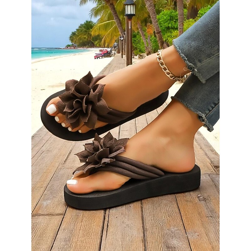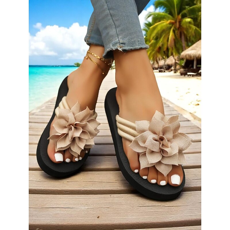 HOT ! Women's Beige Flower Flip Flops with Cushioned Sole Casual Beach Sandals for Summer Vacations and Poolside Relaxation