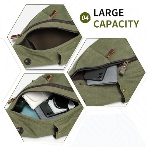Vintage Canvas Sling Bag with Genuine Leather Zipper, 3 in 1 Crossbody, Backpack, and Chest Bag, for Travel, Hiking, 16x10x6 Inches, Green 7