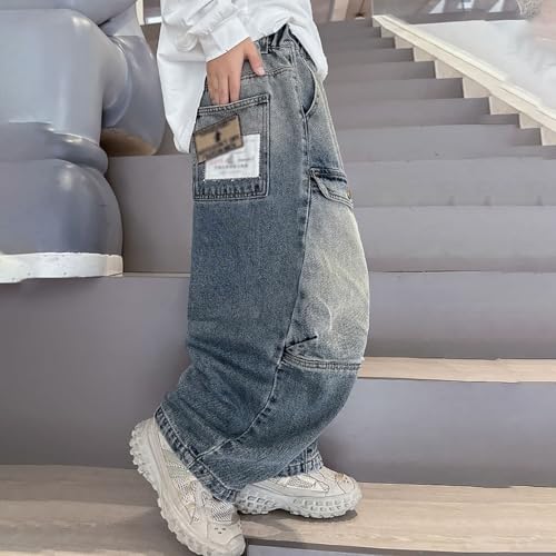 Boys Jeans Baggy Vintage Straight Leg Denim Cargo Pants with Pockets Elastic High Waist Hip Hop Pant 4-14 Years 6