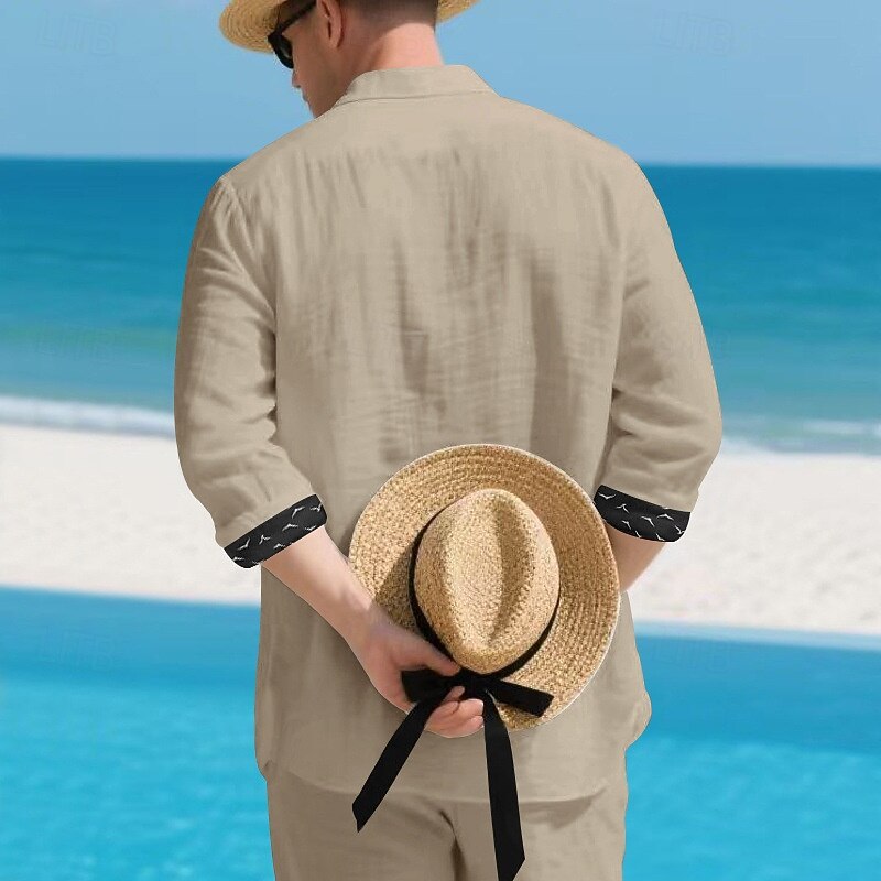 Men's Shirt Linen Shirt Casual Shirt Button Up Shirt Cotton Shirt Color Block Vacation Hawaiian Black White Navy Blue Khaki Long Sleeve Lapel Spring Fall Clothing Apparel Patchwork 1