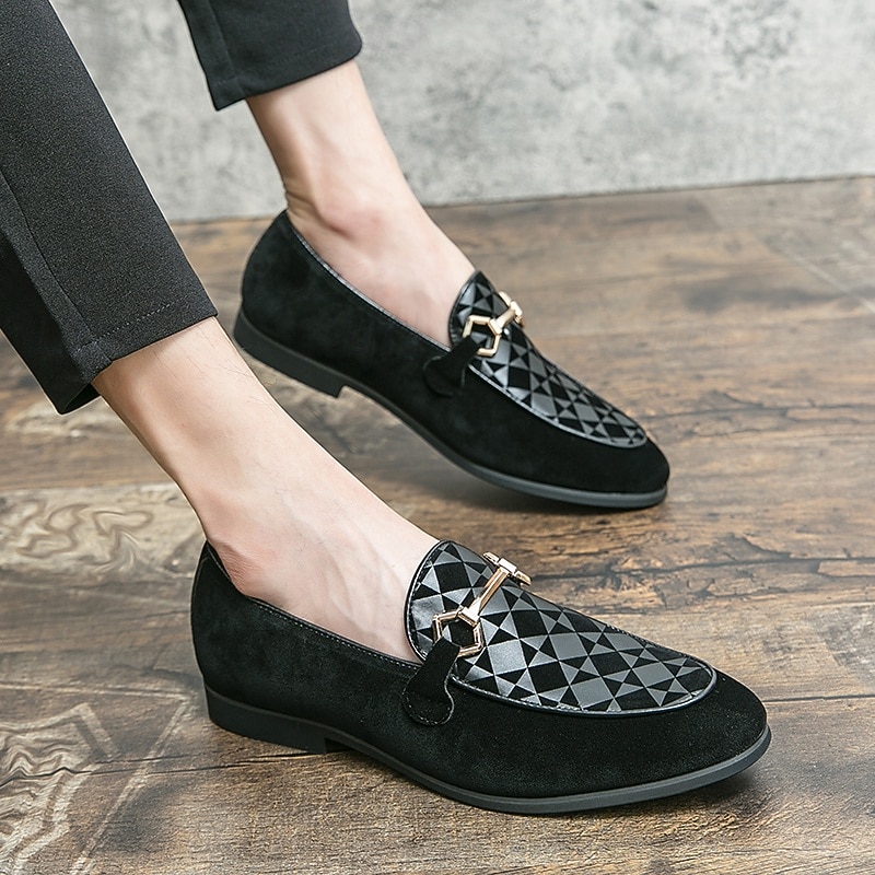 Men's Black Faux Suede Loafers with Geometric Pattern and Metal Buckle – Stylish Slip-On Dress Shoes for Formal Events and Parties 21