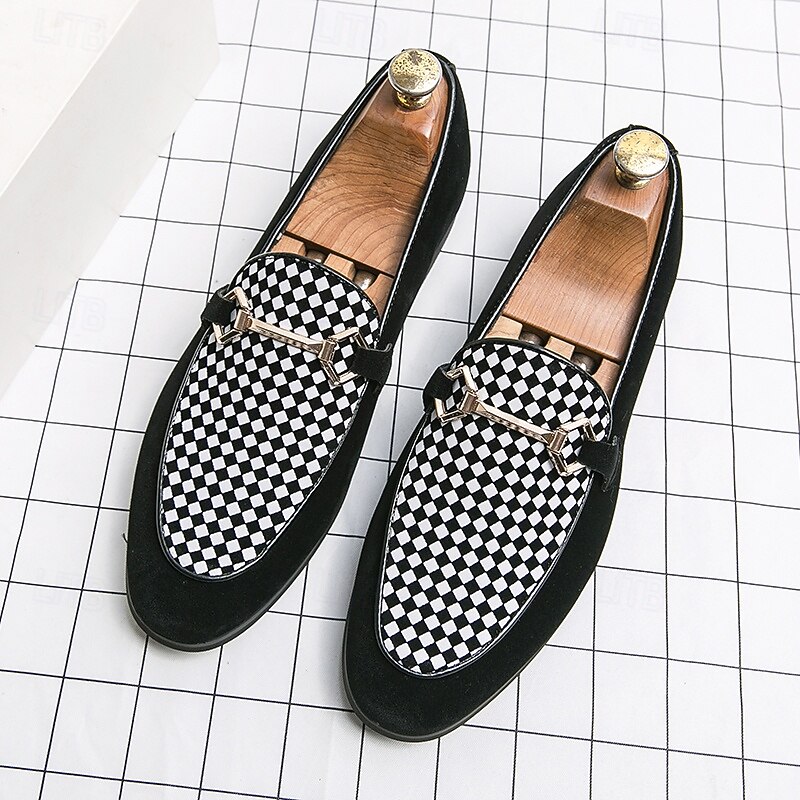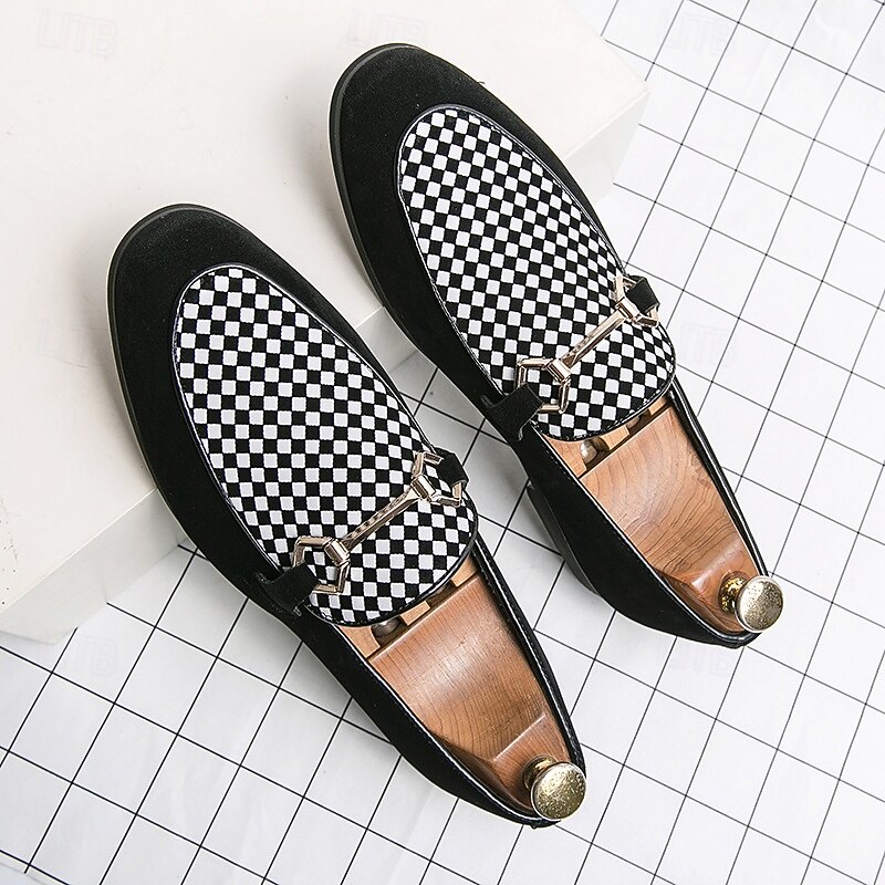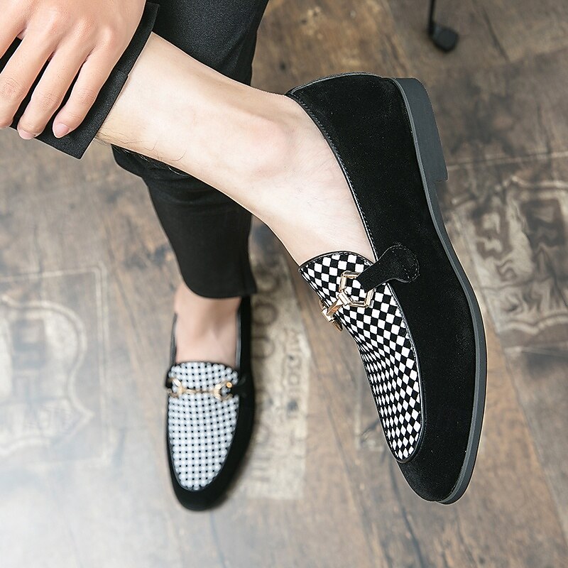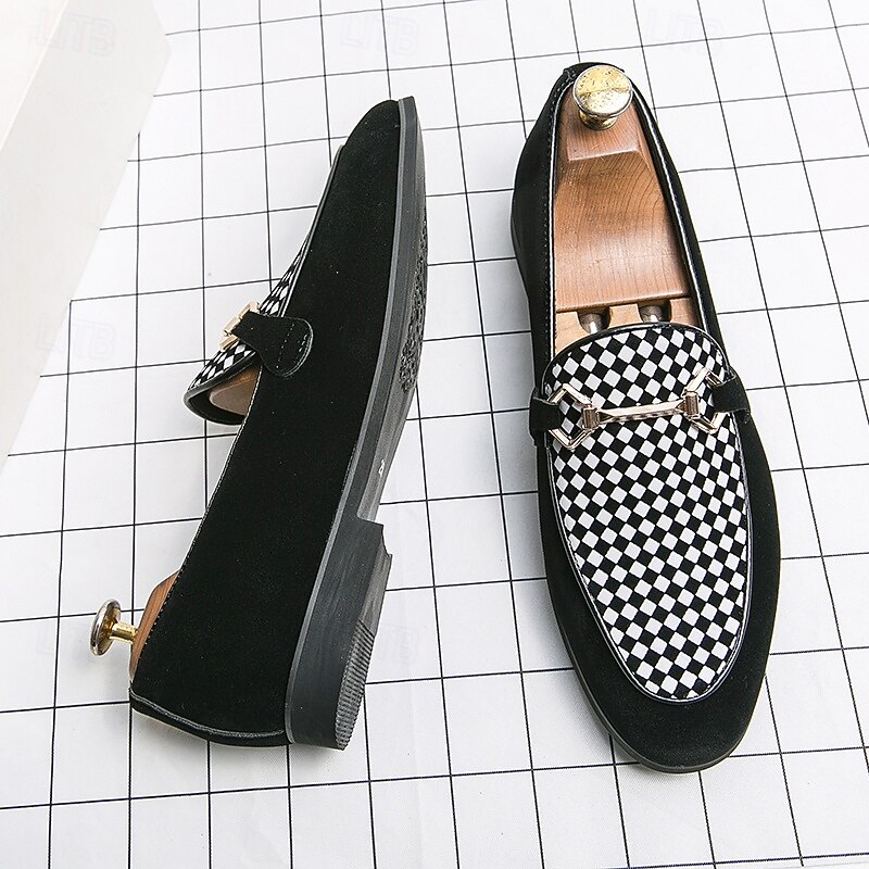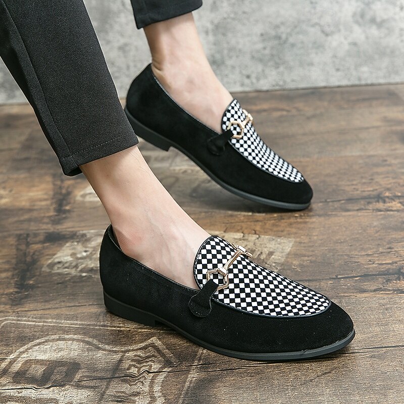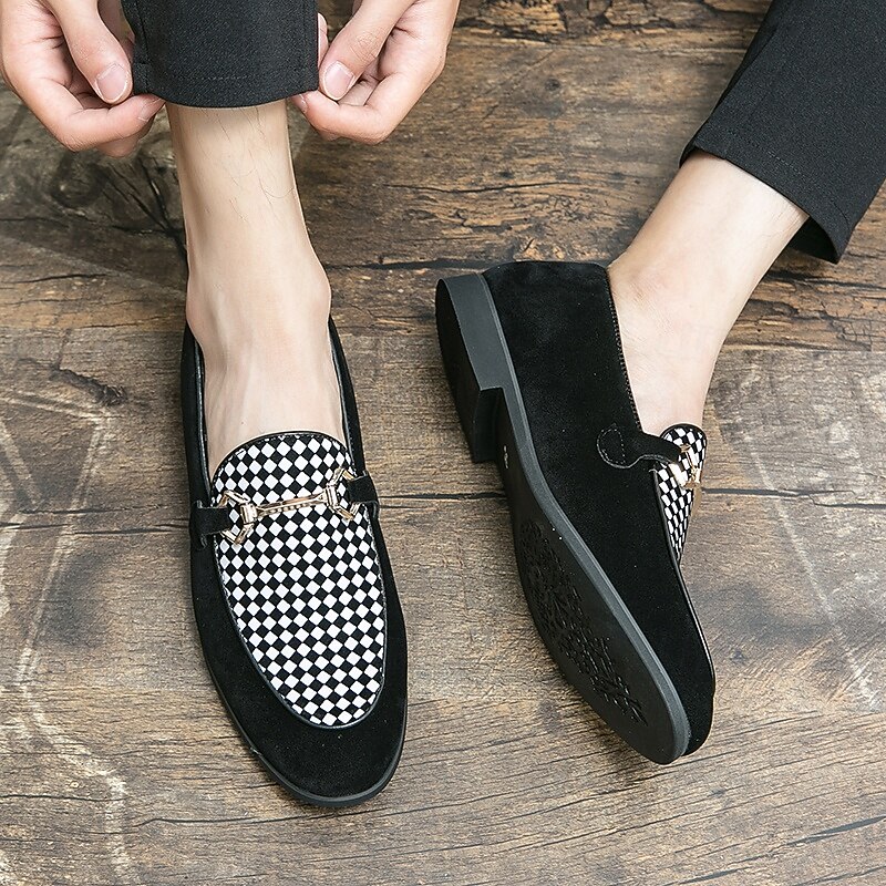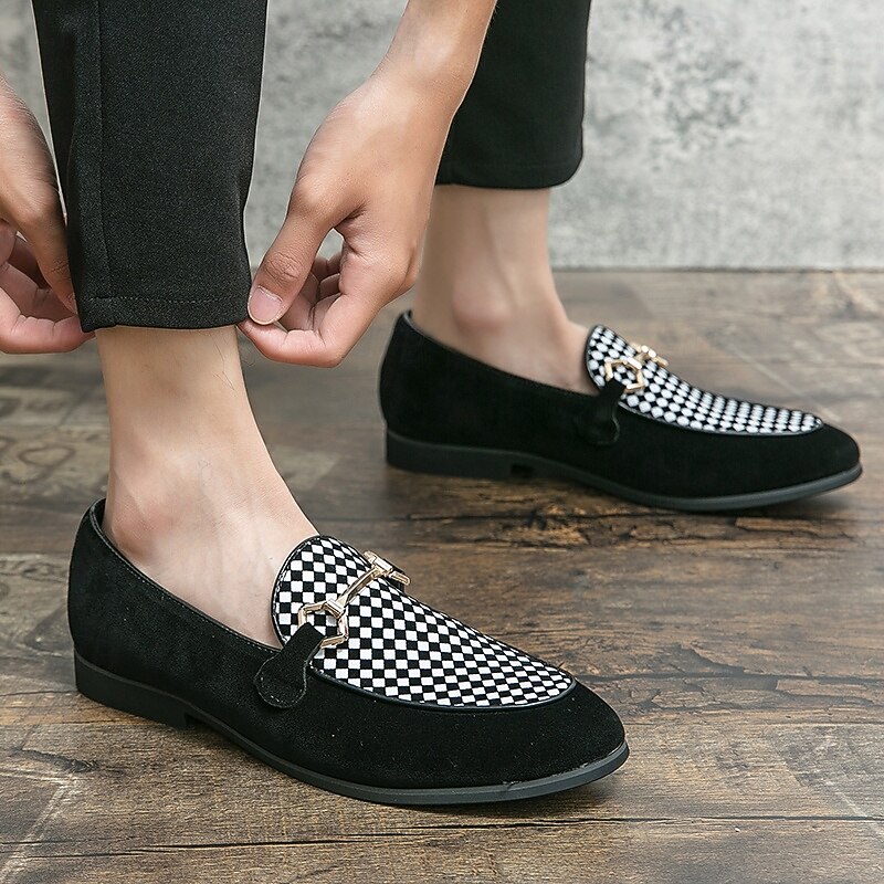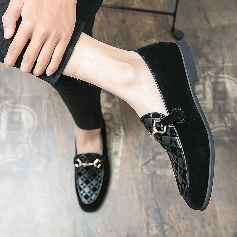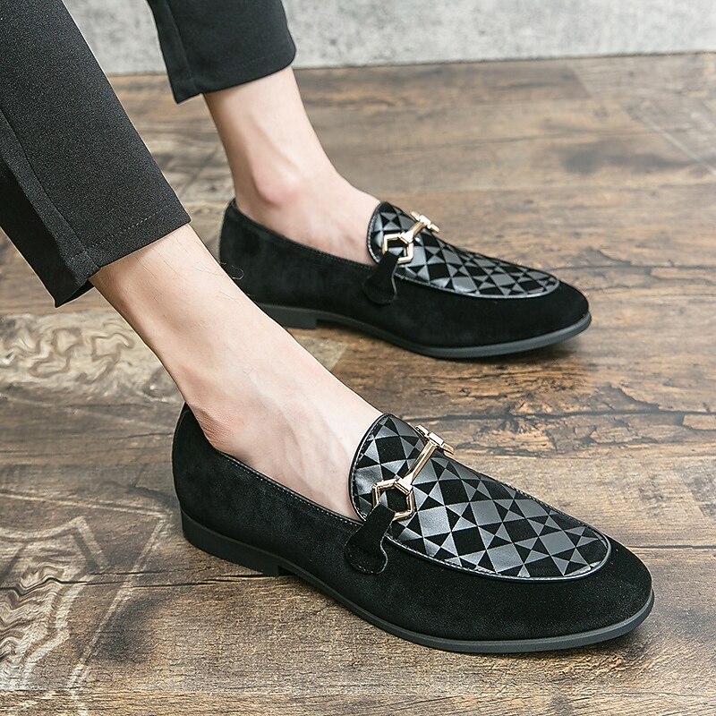 Highlights [Fabric] : Crafted from high-quality PU leather, these men's loafers offer a sleek and sophisticated look with a soft touch. The suede-like texture provides a luxurious feel, enhancing the overall elegance of the design. [Style] : Featuring a refined slip-on silhouette, these loafers combine classic and modern elements, highlighted by a geometric patterned accent. The low heel design ensures comfort and ease, making them suitable for an array of occasions. [Design Highlights] : The loafers are adorned with a striking metal horsebit detail across the top, adding a contemporary flair and a touch of sophistication to their timeless design. The round toe shape enhances comfort, ensuring all-day wearability. [Occasions] : Perfect for formal events and parties, these stylish loafers also transition effortlessly into a more casual setting. Whether dressing up for a business meeting or a casual outing, they serve as a versatile addition to any wardrobe. [Size Range] : Available in a wide range of sizes, including US6 through US12, these loafers accommodate various foot sizes, ensuring a perfect fit for everyone seeking both style and comfort.