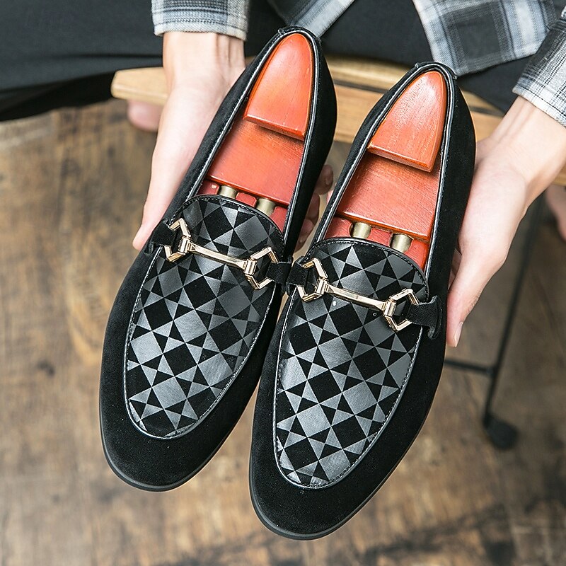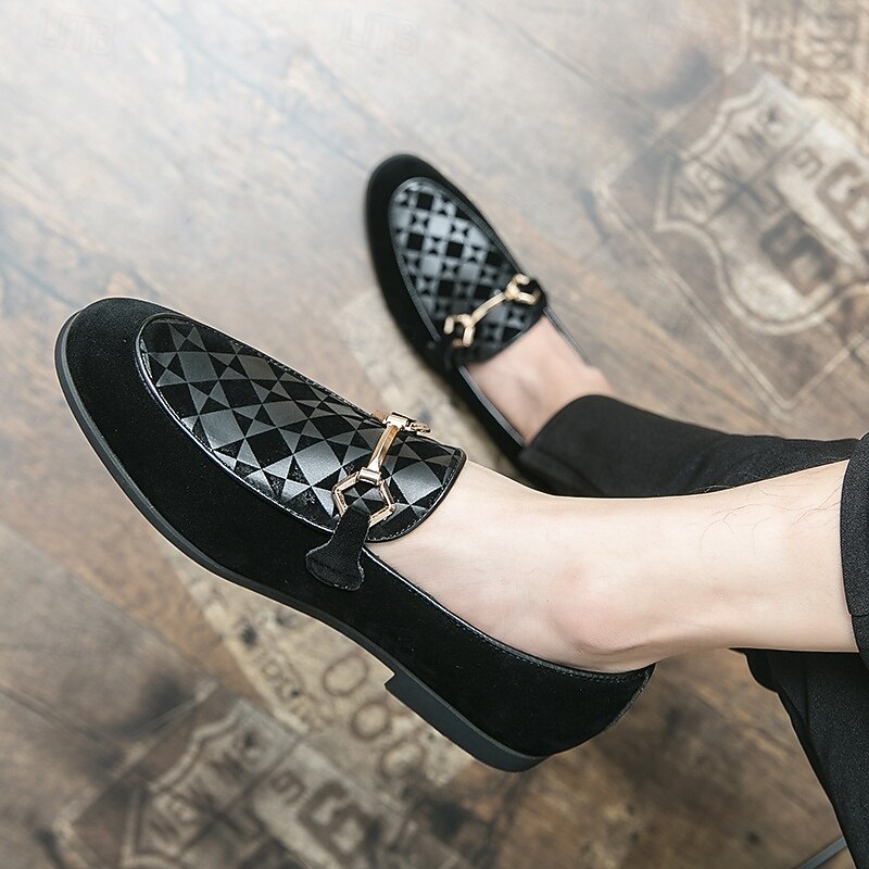 HOT ! Men's Black Faux Suede Loafers with Geometric Pattern and Metal Buckle – Stylish Slip-On Dress Shoes for Formal Events and Parties