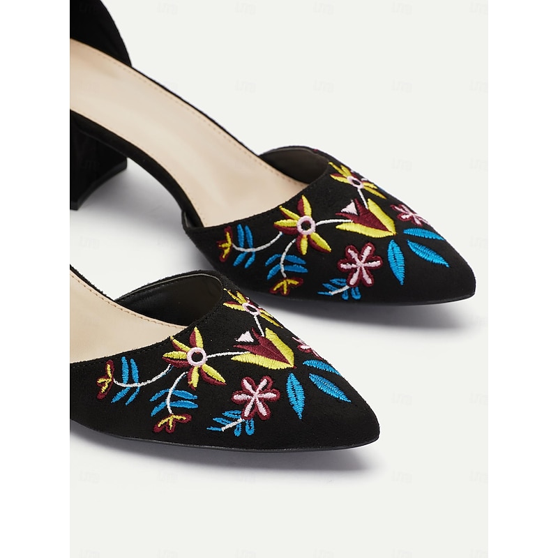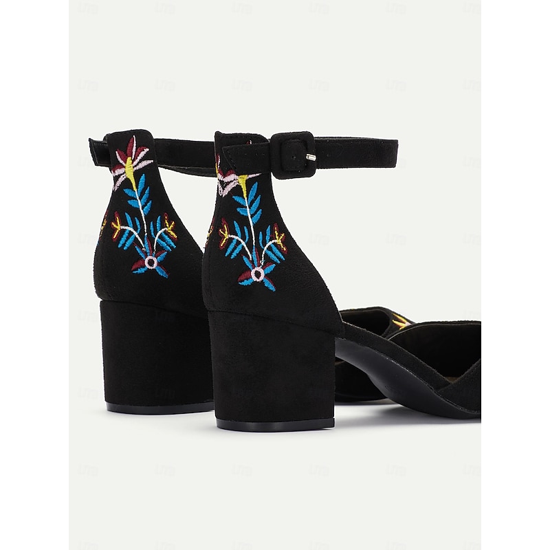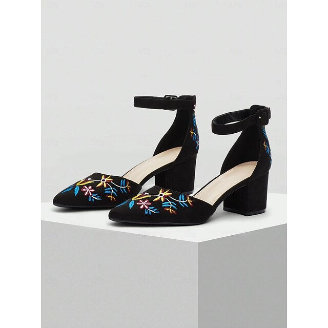 Highlights [Fabric] : Crafted from luxurious faux suede, these women's block heels provide a soft, high-quality texture. The intricate floral embroidery embellishing the shoe adds a feminine touch, made from multicolored threads for a vibrant and artistic look. [Silhouette] : Designed with a pointed toe and supportive ankle strap, these heels offer a sophisticated silhouette that comfortably supports your feet throughout extended wear. The sturdy block heel combines elegance with modern comfort and stability. [Design Highlights] : These elegant shoes feature an ankle strap design that ensures a secure fit while adding a chic accent to the overall look. The vivid floral embroidery on the upper provides a striking detail that enhances any outfit with a touch of artistic flair. [Occasions] : Perfect for a wide range of occasions, from daily office wear to special events and parties. These heels effortlessly elevate your style, whether you're heading to a casual weekend outing or a formal evening event. [Size Range] : Available in a variety of sizes, from US5 to US11, catering to different preferences and ensuring a perfect fit for every wearer. The shoes accommodate a wide range of foot sizes, making them a versatile addition to any wardrobe.