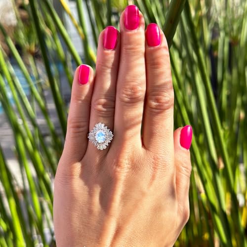 OMRANII Floral Art Deco Ring Oval Natural Moonstone Halo Tapered Baguette Cubic Zirconia Vintage Style Wedding Engagement Rings For Women 925 Sterling Silver Gifts For Her