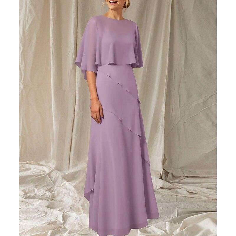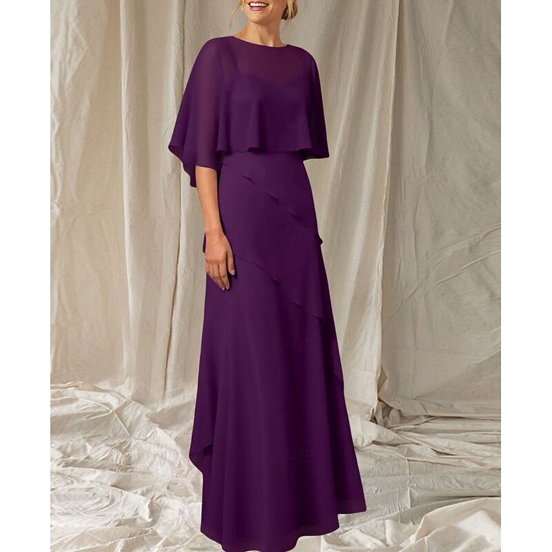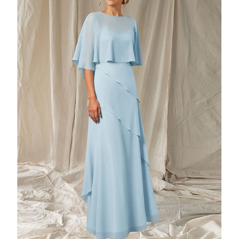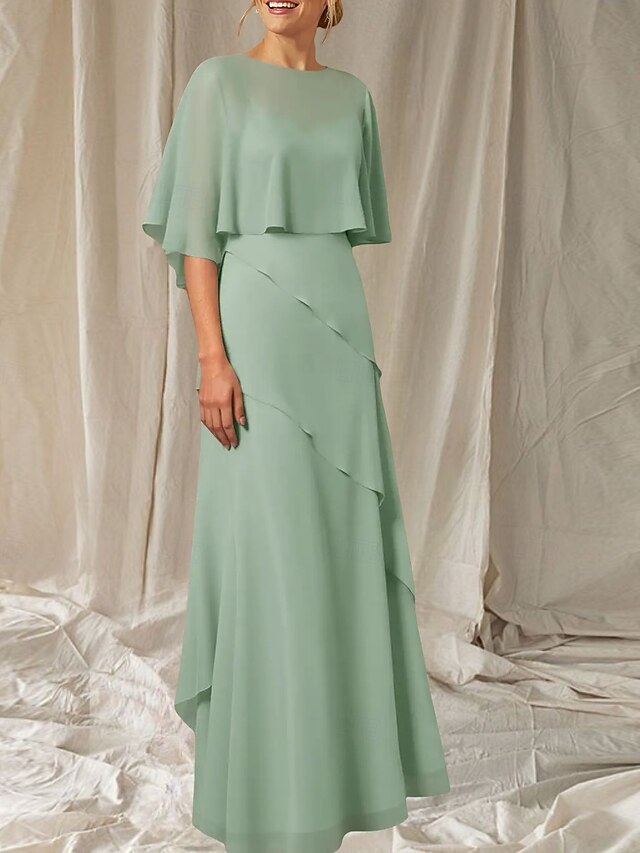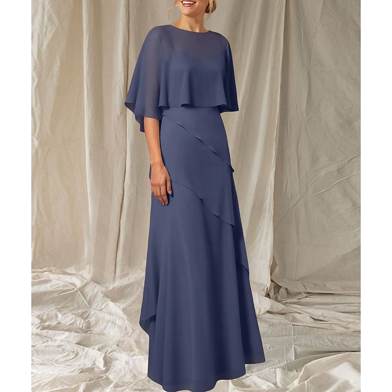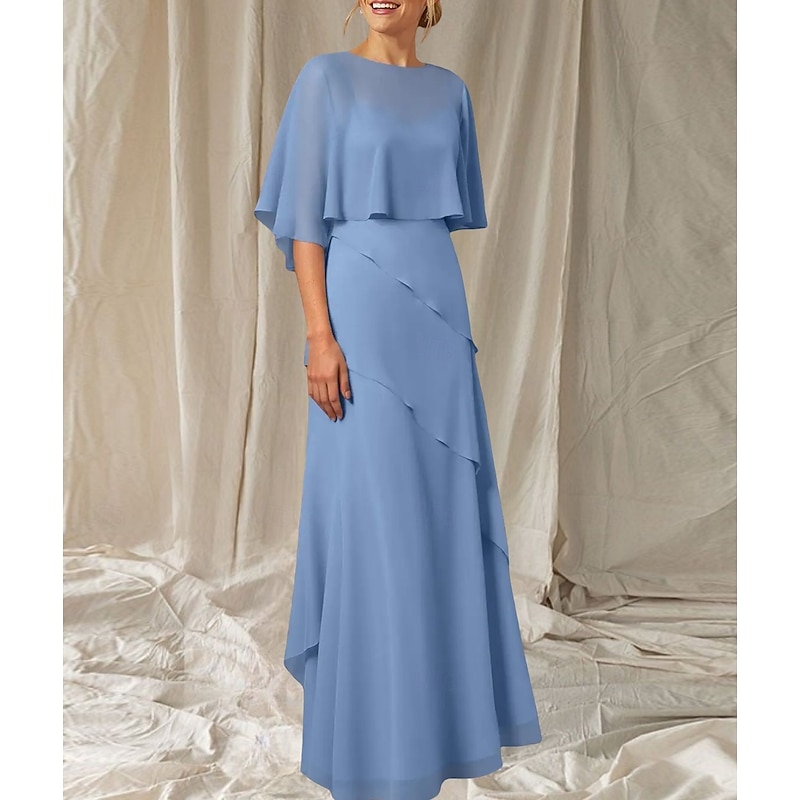 A-Line Mother of the Bride Dress Wedding Guest Elegant Crew Neck Floor Length Chiffon Half Sleeve with Cascading Ruffles 1
