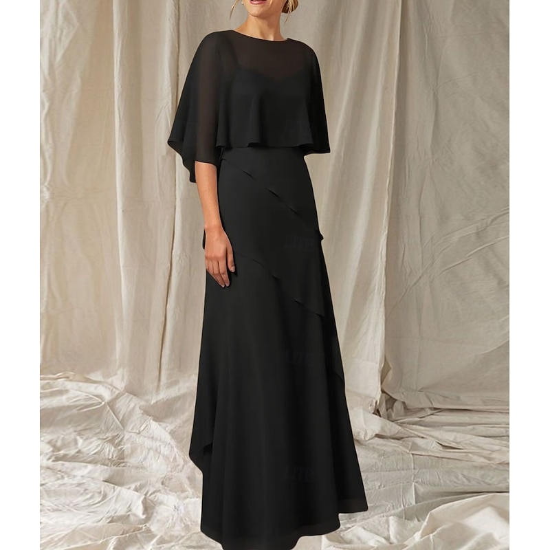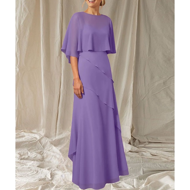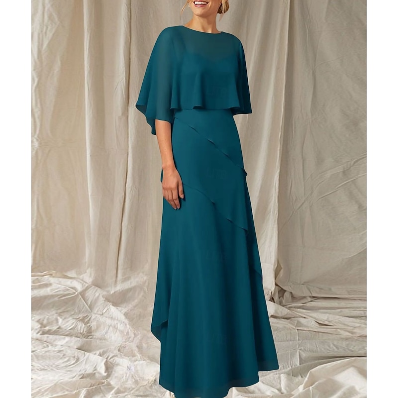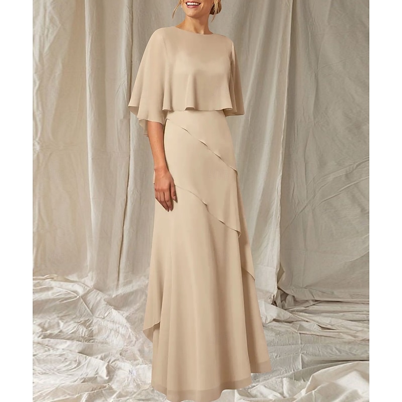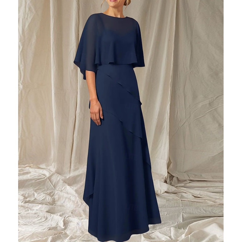 A-Line Mother of the Bride Dress Wedding Guest Elegant Crew Neck Floor Length Chiffon Half Sleeve with Cascading Ruffles 1