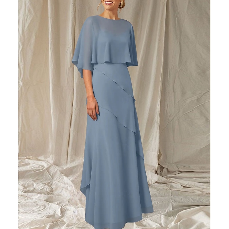 A-Line Mother of the Bride Dress Wedding Guest Elegant Crew Neck Floor Length Chiffon Half Sleeve with Cascading Ruffles 32