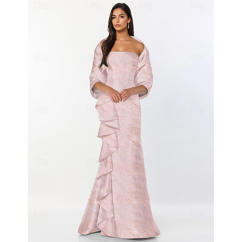HOT ! Cape Dress Jacquard Peplum Dress Marble Mermaid / Trumpet Evening Gown Elegant Dress Formal Semi Formal Black Tie Wedding Floor Length Sleeveless Strapless with Ruffles
