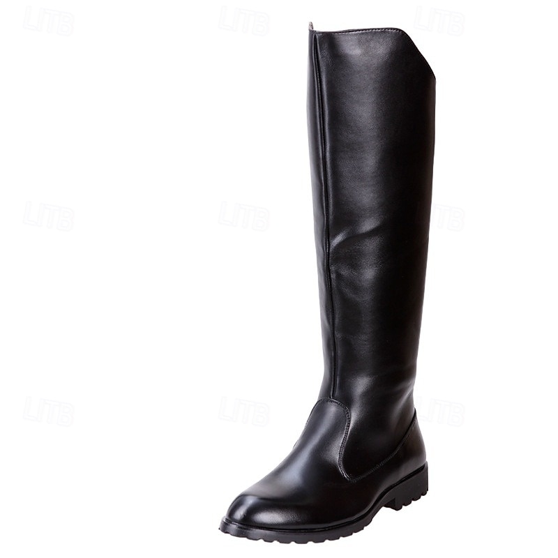Men's Black Faux Leather Motorcycle Riding Boots with Rugged Sole - Classic Equestrian Style Knee-High Biker Boots for Outdoor and Casual Wear 1