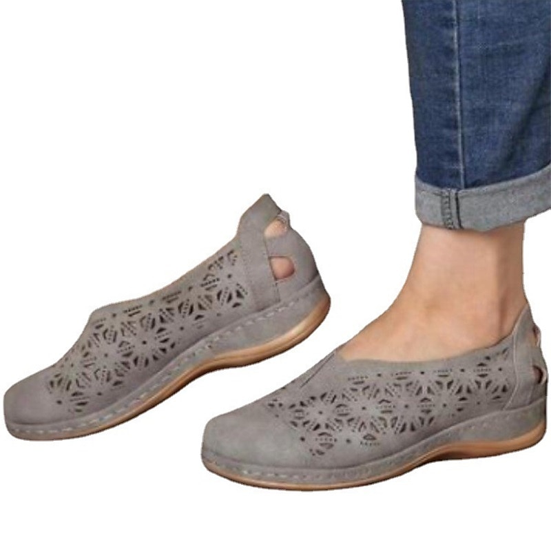 Highlights [Fabric and Material] : These women's slip-on loafers are made from high-quality faux leather, presenting an elegant and durable appearance. The faux leather material is enhanced with intricate laser-cut floral patterns, providing excellent breathability and a decorative aesthetic. [Fit and Style] : Featuring a classic slip-on design, these loafers offer a minimalist and timeless look. They are designed with a flat heel for a comfortable and easygoing fit, making them perfect for everyday wear. [Design Highlights] : The shoes showcase detailed laser-cut designs that not only add a sophisticated touch but also enhance airflow, keeping your feet cool during the summer months. The round toe shape and solid color palette ensure a versatile pairing with various outfits, ranging from casual to semi-formal. [Occasions] : Ideal for daily and outdoor use, these loafers are perfect companions for various activities. Whether you're heading out for a casual day or a leisurely stroll, these shoes provide the necessary comfort and style. [Size Range] : Available in a wide range of sizes from EU 36 to EU 43, accommodating various foot sizes. The UK size equivalent up to 14.5 ensures that you can find the perfect fit. Available in versatile colors like Black, Camel, Navy Blue, Dark Brown, and Grey to match your personal style.