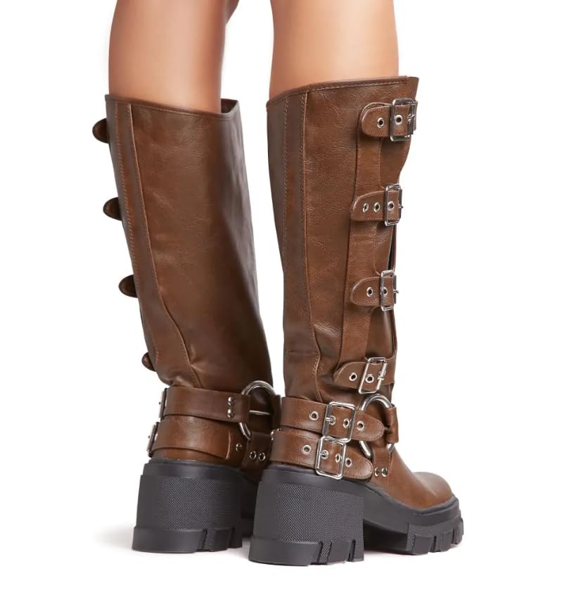 HOT ! LEMONADE Buckle Up Now Women's Side Buckle Detail Chunky Sole Mid Calf Biker Boot