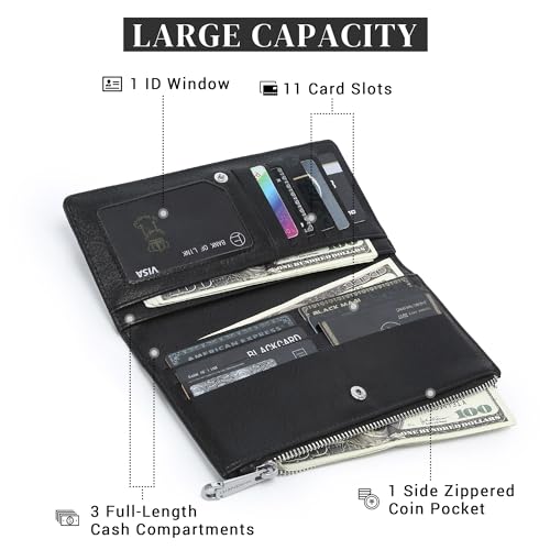 • 【Practical Design】: This bifold wallet features 11 card slots to neatly store your credit, debit, and membership cards, along with a clear ID window for quick access to your identification. 3 full-length cash compartments keep your bills receipts well-organized, while the side zippered coin pocket securely stores loose change and keys. The snap closure and durable zippers provide added security, ensuring your essentials are safe and easily accessible at all times. Perfect for everyday use.