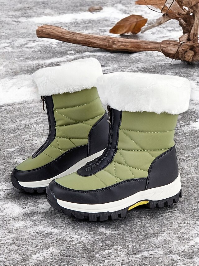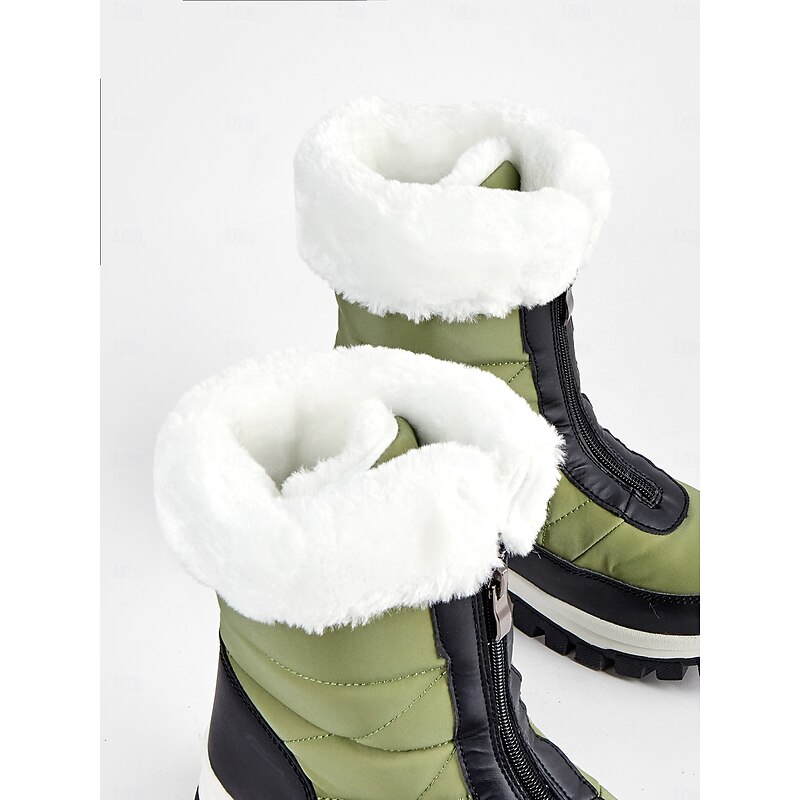 Highlights [Fabric] : Crafted with a combination of faux leather and cloth, these winter snow boots offer a durable and water-resistant exterior. The quilted upper material provides extra warmth and a chic, modern appearance. The plush white faux fur collar adds a luxurious touch and additional insulation for those chilly days. [Fit] : Designed with practicality in mind, these boots feature a flat heel and a supportive structure, delivering both comfort and style. The side zipper closure ensures a snug fit, allowing for easy on and off transitions. [Design Highlights] : The boots boast a robust rubber outsole with a deep tread pattern that guarantees excellent grip and stability on slippery surfaces. Their contrast color pattern in a striking mix of green and black elevates the aesthetic while maintaining functionality. [Occasions] : Perfect for outdoor activities such as hiking in snowy or wet conditions, these boots seamlessly blend practicality with fashionable elements, making them ideal for daily wear or more adventurous outings. [Size Range] : Available in a variety of sizes to suit different foot shapes, these boots come in US sizes 6, 6.5-7, 7.5, 8, 8.5, 9, and 9.5-10, accommodating women across a wide range of sizes.
