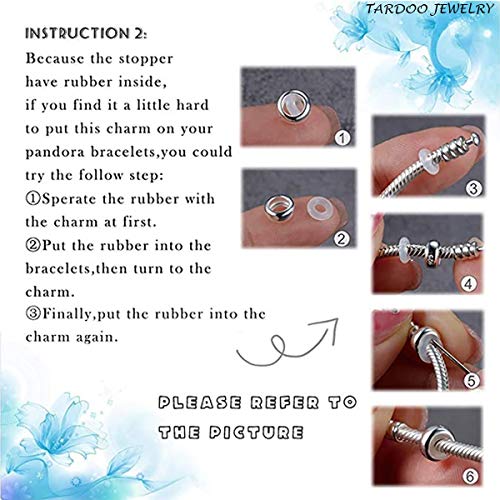 • Instruction Attention: If you cannot put this charm on your bracelet; See video for details: 1. Remove the rubber ring from the silver ring; 2. Then put the rubber ring on your bracelet or chain; 3. Put the silver ring on your bracelet or chain; 4. Put the rubber ring back into the silver charm stopper
