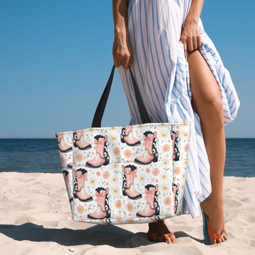 HOT ! Large Beach Bags for Women Sandproof - Bow Cowboy Boots Q Print Summer Work Travel Tote Bags with Zipper