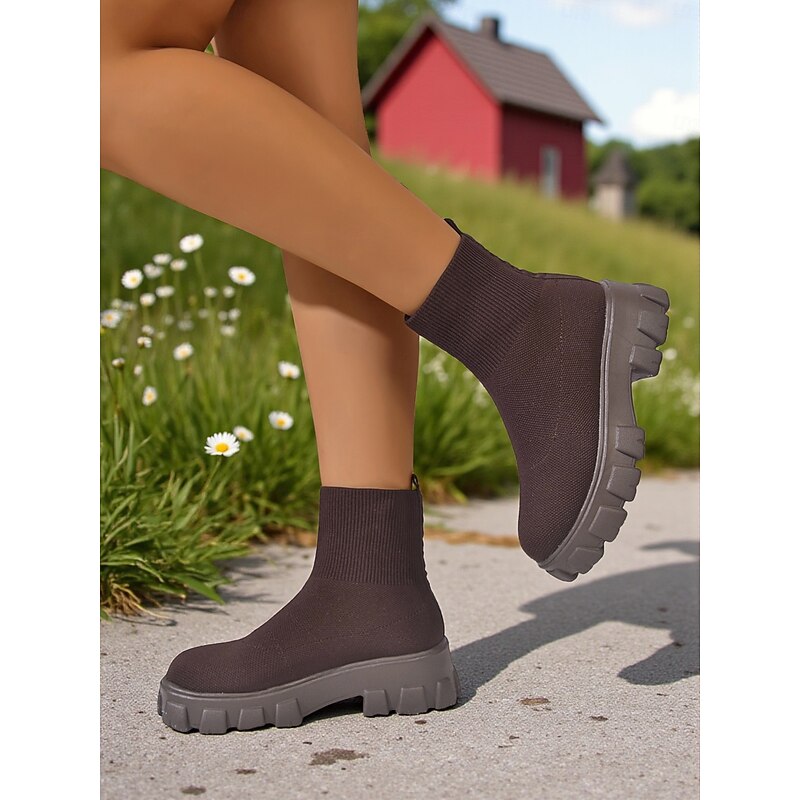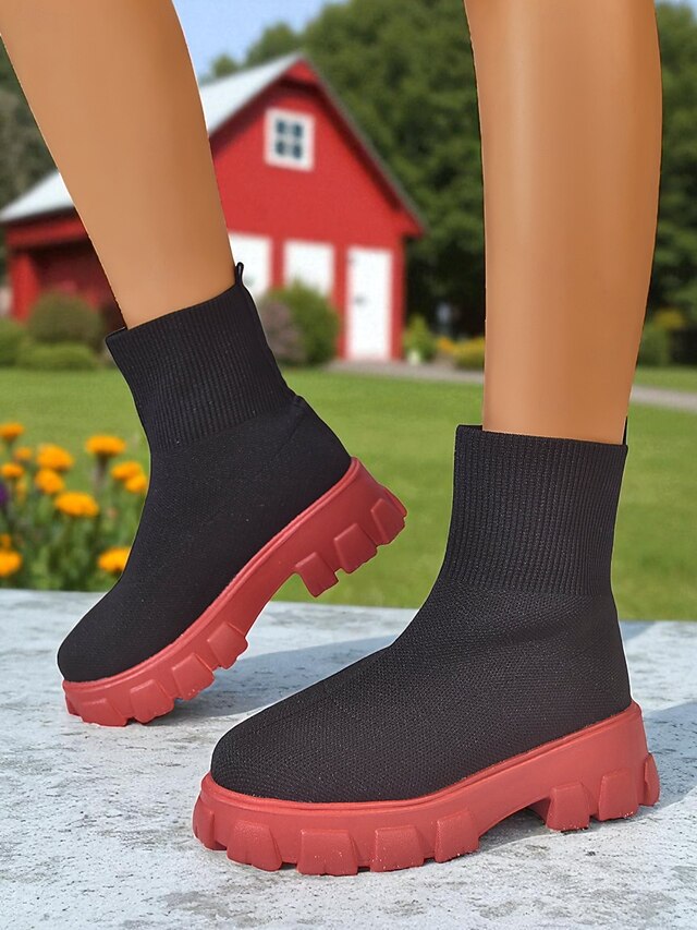 HOT ! Women's Black Sock Boots with Chunky Red Soles – Stylish Stretch Knit Ankle Boots for Streetwear, Autumn & Winter Outfits