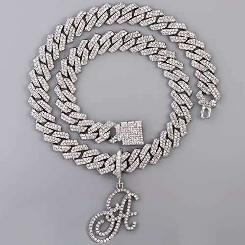 HOT ! Gold Silver Plated Initial Cuban Link Chain Necklace for Women Cursive Letter Gold Miami cuban link chain Iced out chain with pendant for women