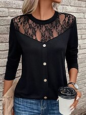 Highlights [Fabric] : This elegant women's blouse is crafted from a high-quality polyester fabric, offering a blend of durability and comfort. The material's micro-elasticity ensures a comfortable fit, making it ideal for daily wear during fall and winter. [Fit] : The blouse features a regular fit silhouette that strikes a perfect balance between relaxed comfort and a flattering shape, ensuring ease of movement for everyday activities. [Design Highlights] : A sheer lace panel with intricate floral patterns adorns the upper part of the blouse, lending a touch of femininity and sophistication. The button-down front is enhanced with contrasting buttons for added visual interest, while the classic crew neck complements the ornate lace design. [Occasions] : This versatile blouse is suitable for various occasions, from casual daily outings to more dressed-up events. Pair it effortlessly with jeans for a laid-back yet polished appearance, making it a staple piece in any fall or winter wardrobe. [Size Range] : Available in sizes S, M, L, XL, and 2XL, this blouse offers a range of options to accommodate different body types, ensuring everyone can find their perfect fit.