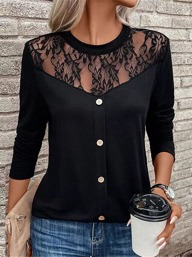 HOT ! Women's Elegant Lace Tops Eyelet Sexy Blouse Casual Solid Color Regular Tops Long Sleeve Crew Neck Lace Patchwork Buttons Regular Fit Daily Black Romantic Petite Tops Summer Holiday Wear Evening Tops