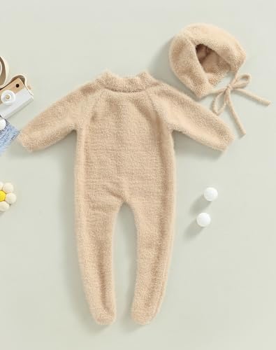 Newborn Infant Baby Girls Boys Jumpsuit Fleece Rompers Long Sleeve Footie Jumpsuit Hat Outwear Winter Warm 4