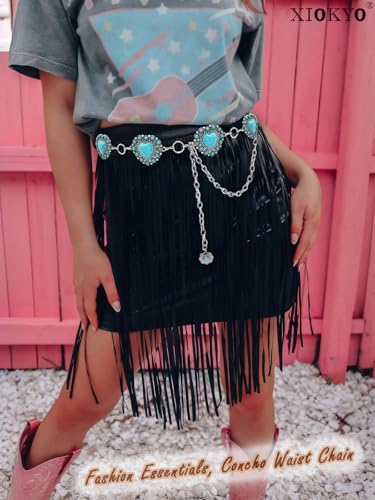 • Stylish Turquoise Design with Bohemian Flair: This Xiokyo Turquoise Belt features a stunning blend of turquoise, alloy, and diamond conch fittings, creating a bold and bohemian western look. The unique design includes 9 turquoise conchos and a bead end pendant, making it the perfect accessory to complement your western or country-themed outfits.