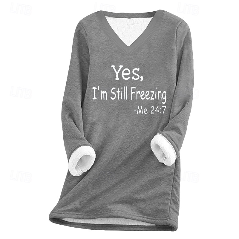 Women's Fleece Lined Pullover Sweatshirt Pajamas Pullover Sweatshirt Yes Im Cold  Letter Streetwear Casual Long Sleeve V Neck Regular Tops Home Street Holiday Print Black Pink Navy Blue Light Grey 10