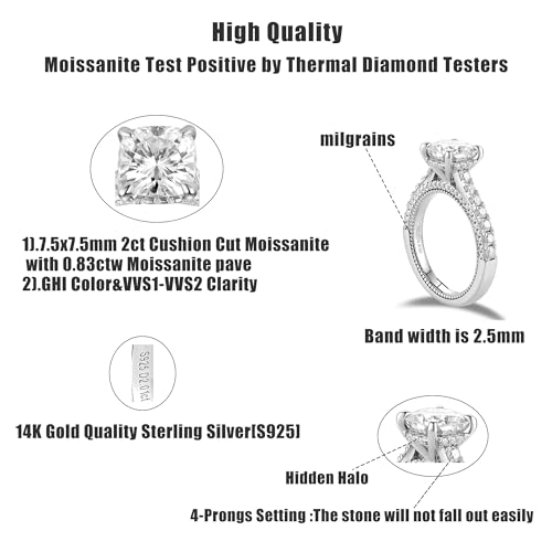 DovEggs Moissanite Engagement Rings for Women 2ct 7.5x7.5mm G-H-I Color Cushion Lab Created Diamond Moissanite Hidden Halo Wedding Rings 14k Gold Quality Sterling Silver