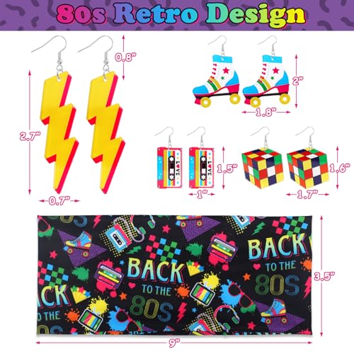 • [ Package Includes ] - You will receive 4 pairs of earrings and 4 pcs headbands, available in different styles. The neon earrings feature classic elements like lightning bolts, cassettes tapes, roller skates and cubes. Each pair of earrings is individually packaged. These stylish accessories to match your 80s hairstyle or outfit will add a touch of elegance or whimsy to any occasion.