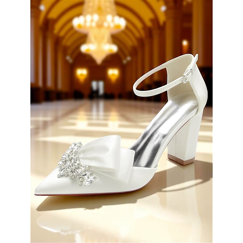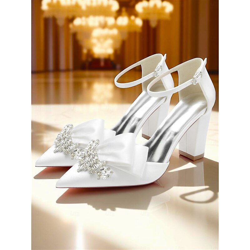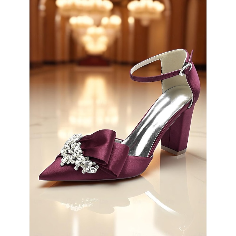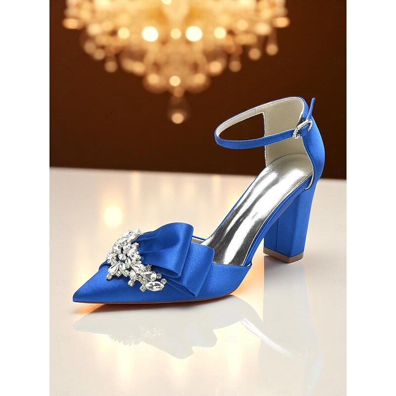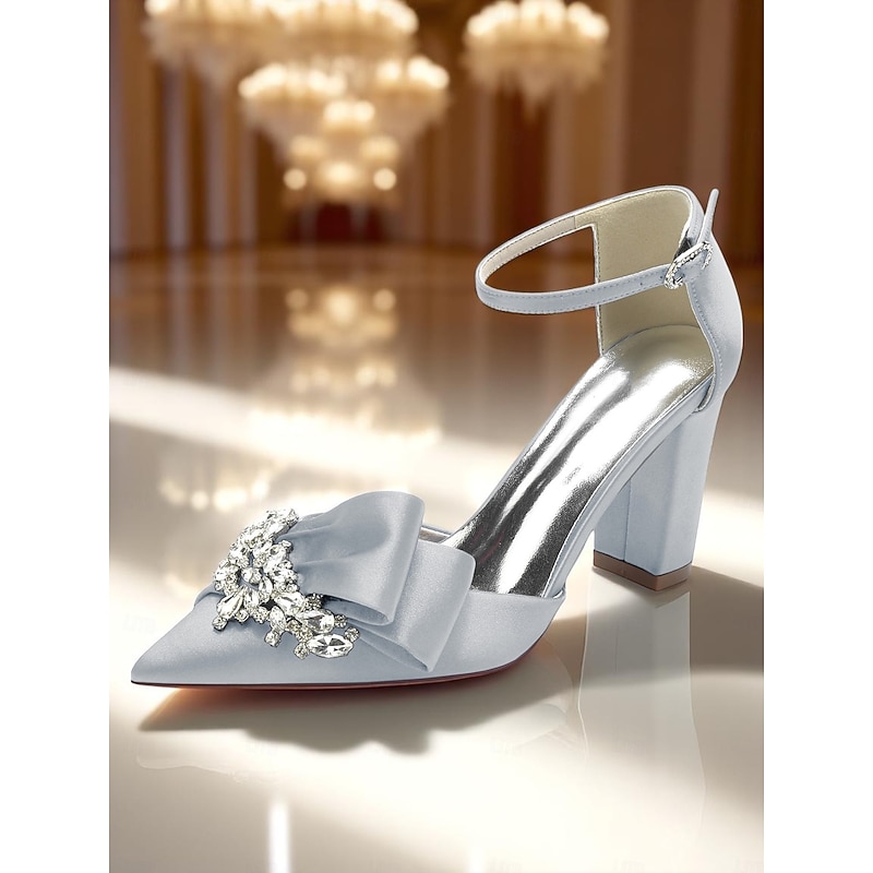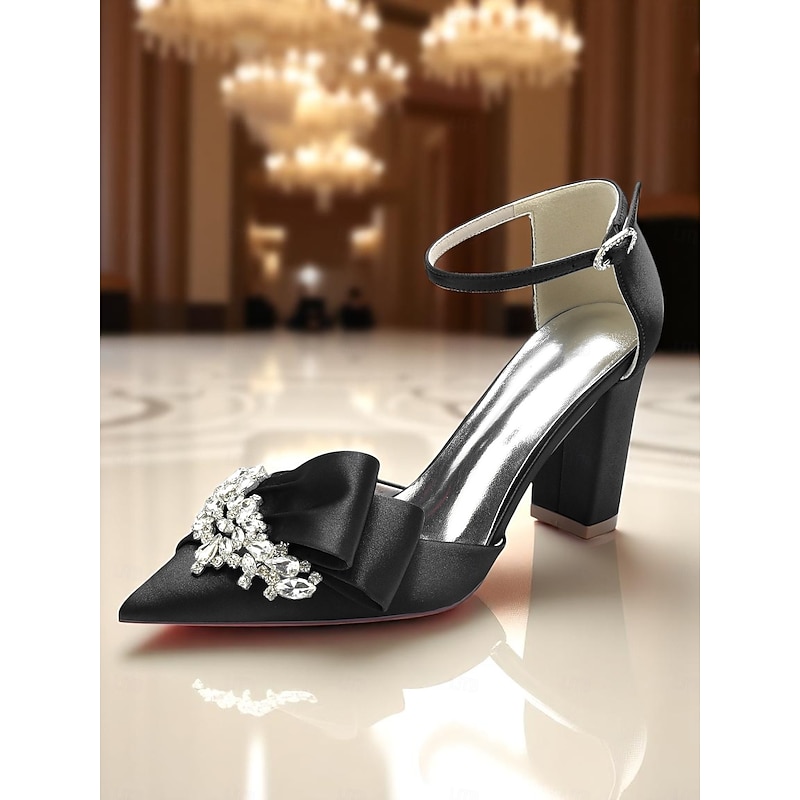 HOT ! Women's Satin Block Heel Pumps with Crystal Bow and Rhinestone Detail, Pointed Toe High Heels for Upscale Parties and Cocktail Events