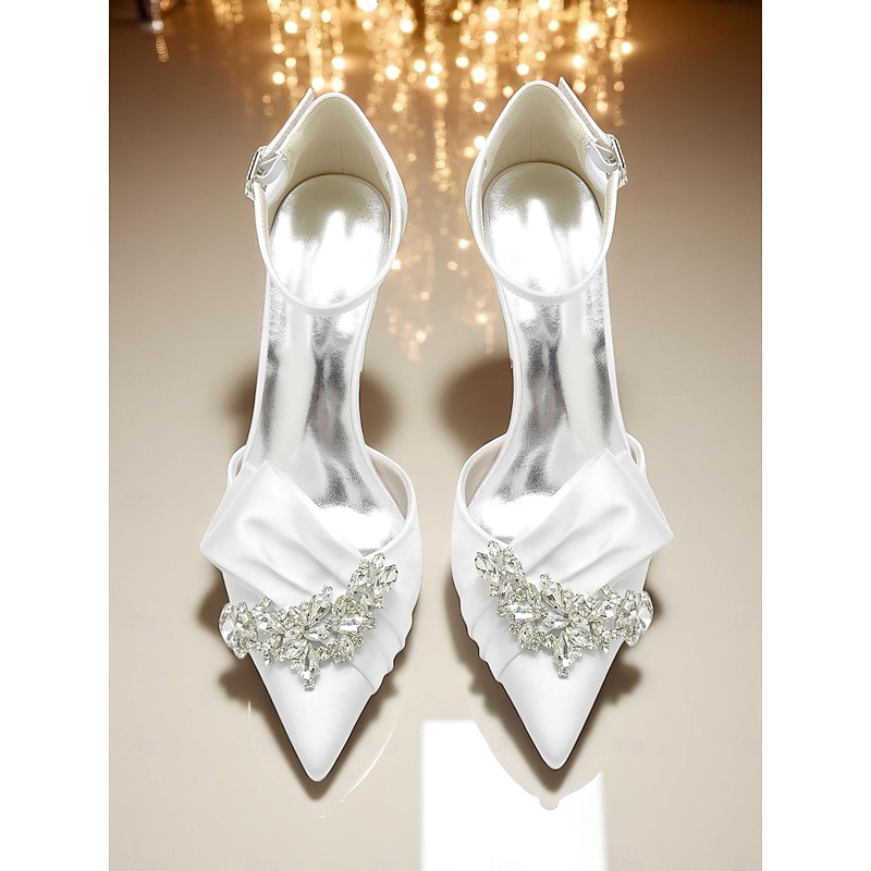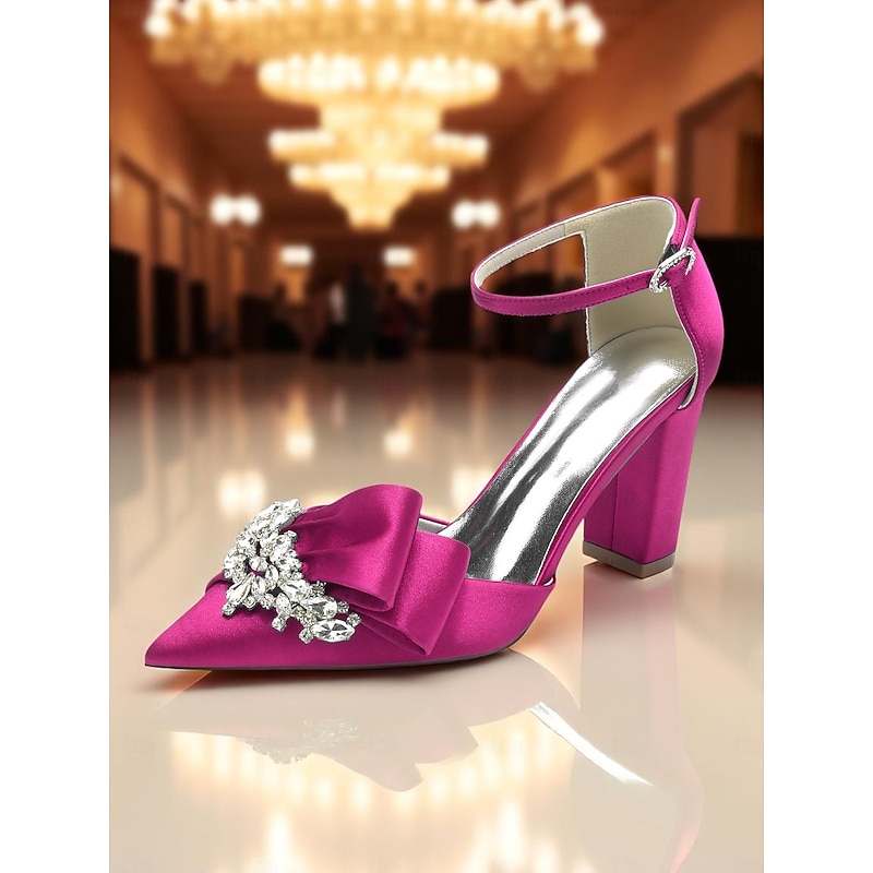 Highlights - Luxurious satin upper material - Elegant synthetic leather lining - Sparkling rhinestone embellishment - Comfortable chunky heel - Chic pointed toe shape - Durable rubber outsole