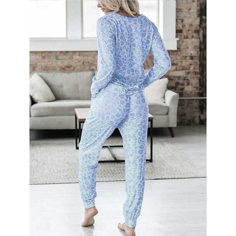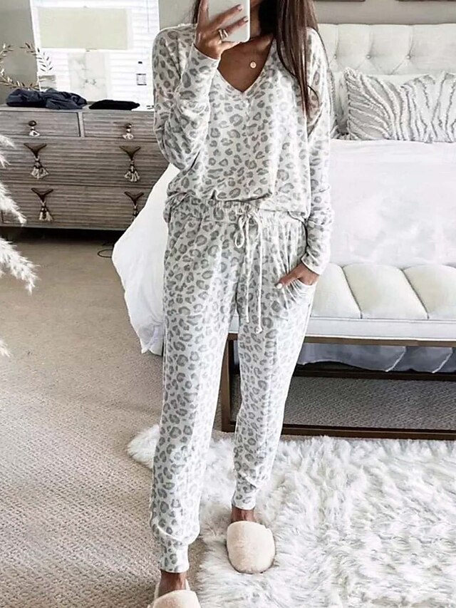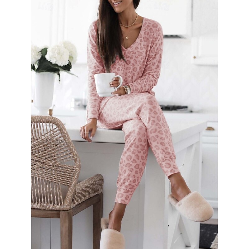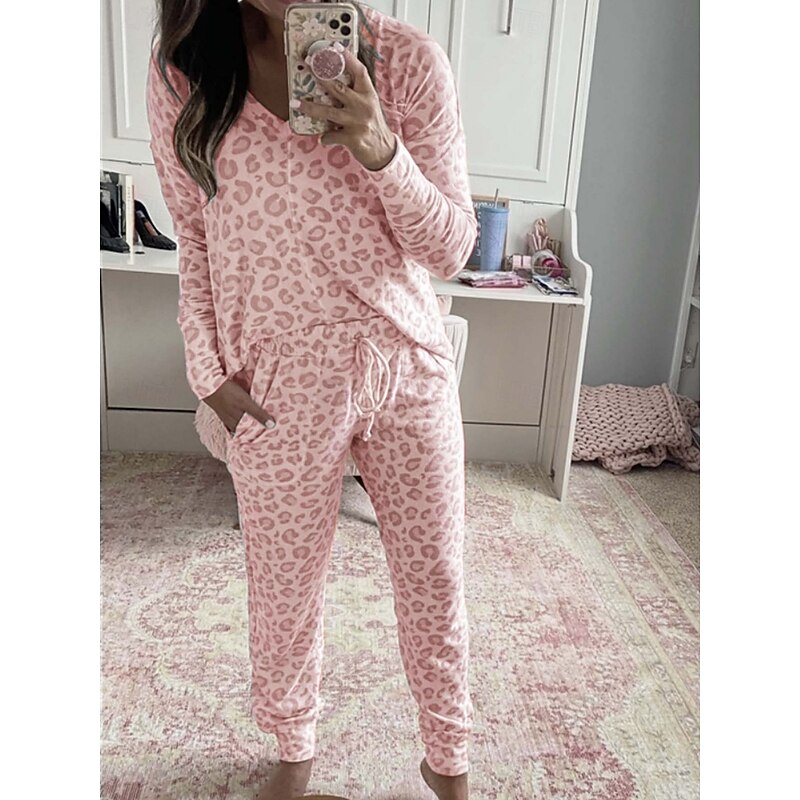 HOT ! Women's Pajama Set Casual Comfort Leopard Elastic Waist T Shirt Pant Home Daily Long Sleeve V Neck Pink Blue Gray Summer Spring Fall Regular Fit