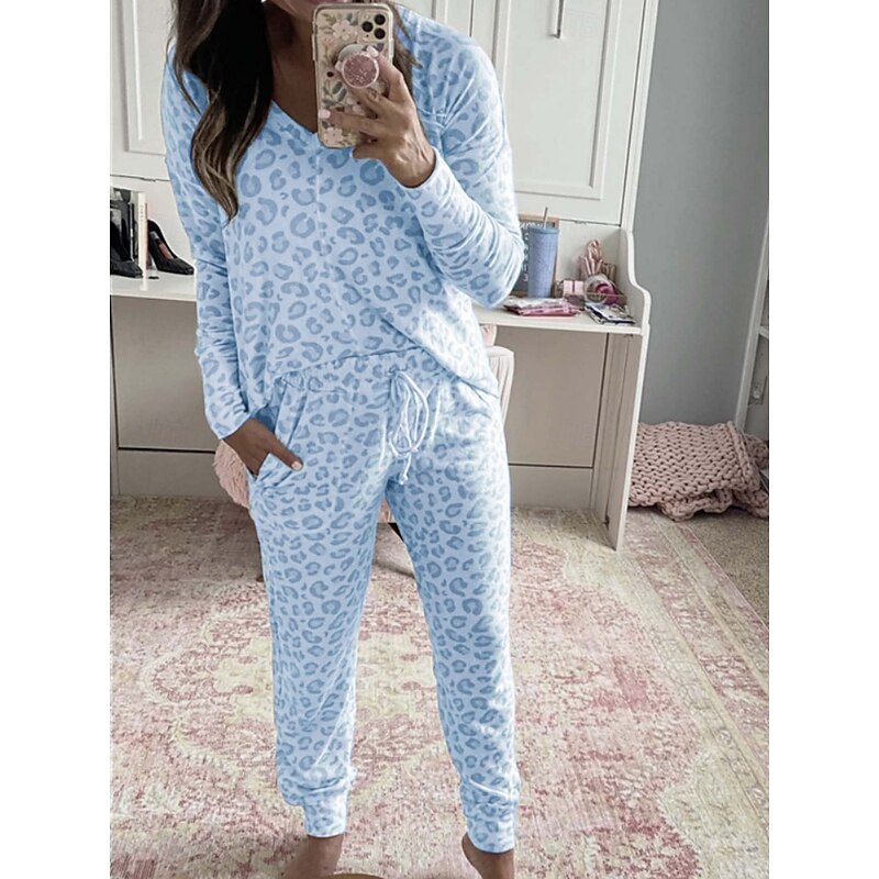 More information about Women's Pajama Set Casual Comfort Leopard Elastic Waist T Shirt Pant Home Daily Long Sleeve V Neck Pink Blue Gray Summer Spring Fall Regular Fit