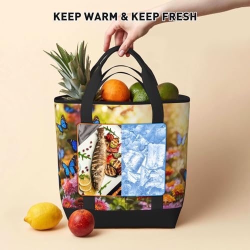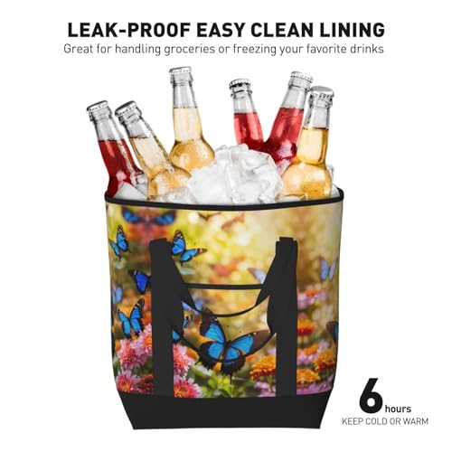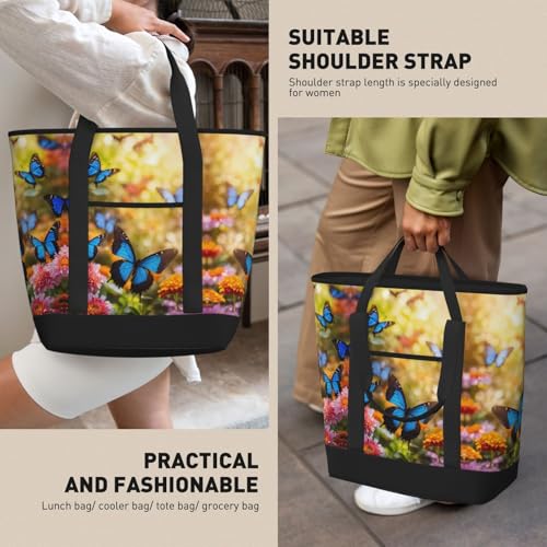 HOT ! blue butterfly and Flowers Print Tote Bag Adult Heavy Duty For Picnic Beach Camping Large Capacity Insulated Tote Bag