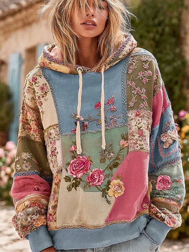 Women's 3D Print Vintage Boho Hoodie Patchwork Hoodie Sweatshirt Floral Pullover Sweatshirt Oversized Long Sleeve Casual Warm Active Hooded Street Dailywear Dark Blue Purple Green Spring Fall Winter 10