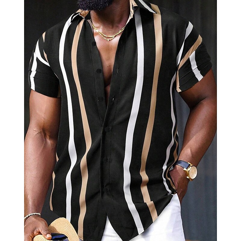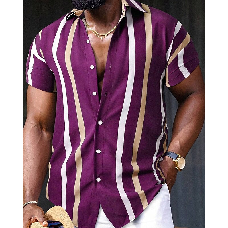 Highlights - Stay cool and stylish all summer long with our polyester short sleeve shirt for men - Perfect for a casual vacation look with its striped pattern and lapel neckline - Features a trendy button design for added flair - Versatile enough to be dressed up or down for any occasion.