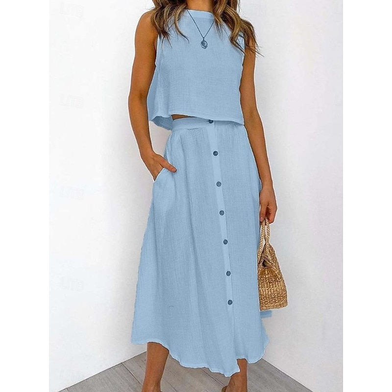 Ideal for casual daily wear, weekend outings, and relaxed summer gatherings, this skirt is a versatile choice for many occasions. Its fresh and crisp look makes it easy to transition from a casual day out to a laid-back evening event, especially when paired with a woven straw bag.