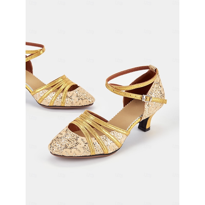 Highlights [Fabric] : Crafted with sparkling glitter, these dance shoes combine elegance and durability, ensuring you shine with every step. The fabric lining contributes to a comfortable fit, allowing for extended wear without discomfort. [Silhouette] : Designed with a round toe and a low 5cm flare heel, these shoes provide a classic yet stylish look, perfect for enhancing your posture and grace while dancing. [Design Highlights] : Featuring intricate lace with a golden hue and charming cross straps, these shoes offer a secure fit with a modern touch. The lace-up closure ensures flexibility and support, allowing for dynamic dance movements. [Occasions] : Ideal for Latin dance occasions like Samba, ChaCha, and Rumba, as well as party and evening events. These shoes are perfect for anyone seeking both style and comfort, whether you’re performing or attending a formal gathering. [Size Notice] : Available in a wide range of sizes from US5.5 to US10, these shoes are designed to fit most women comfortably. Simply select your usual size for a perfect fit.