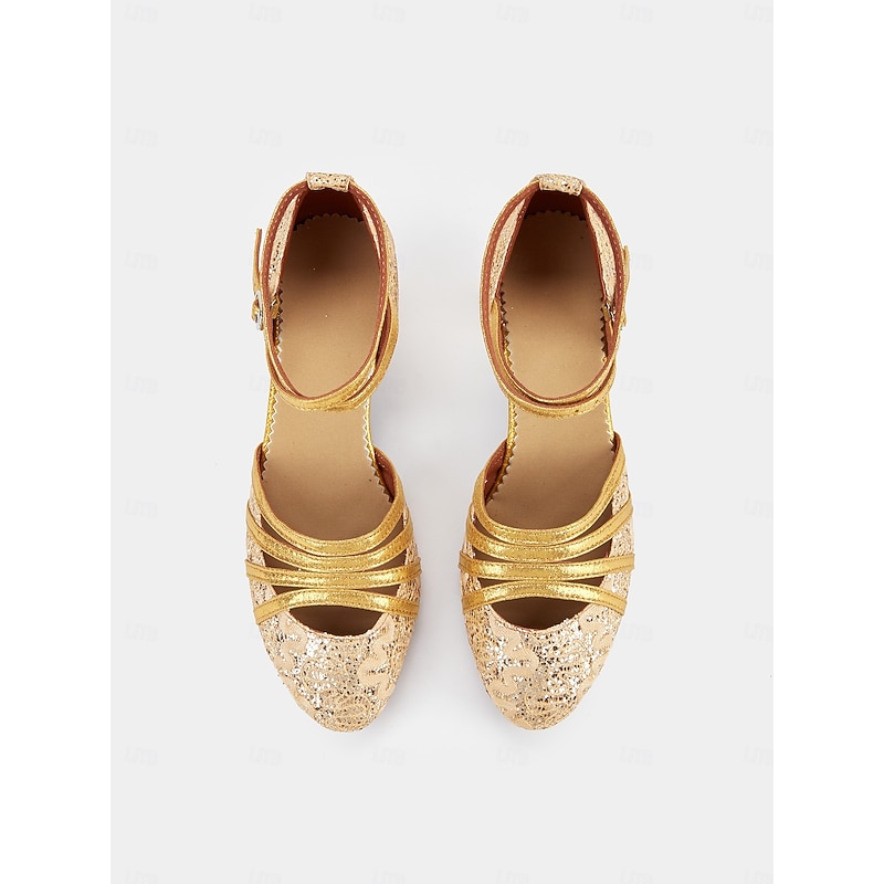 Golden Sparkle Women's Latin Dance Shoes with Lace and Cross Straps - Elegant Ballroom Performance Footwear 17